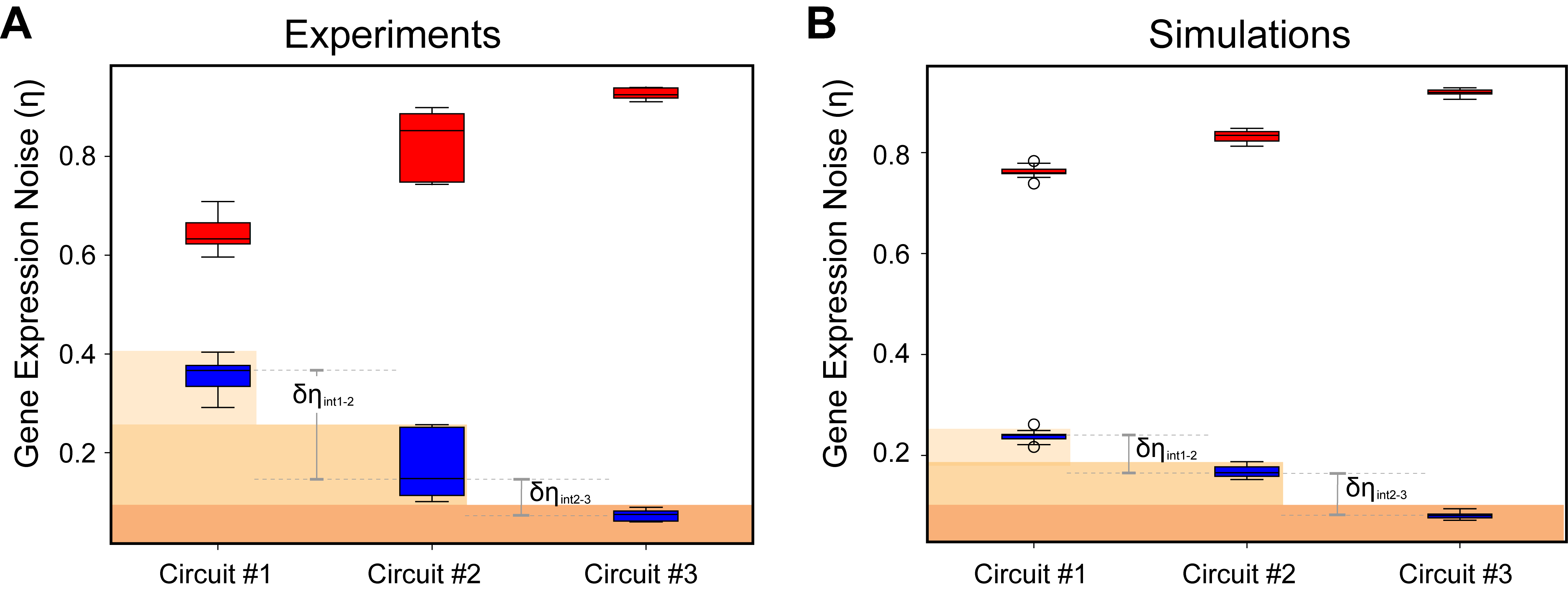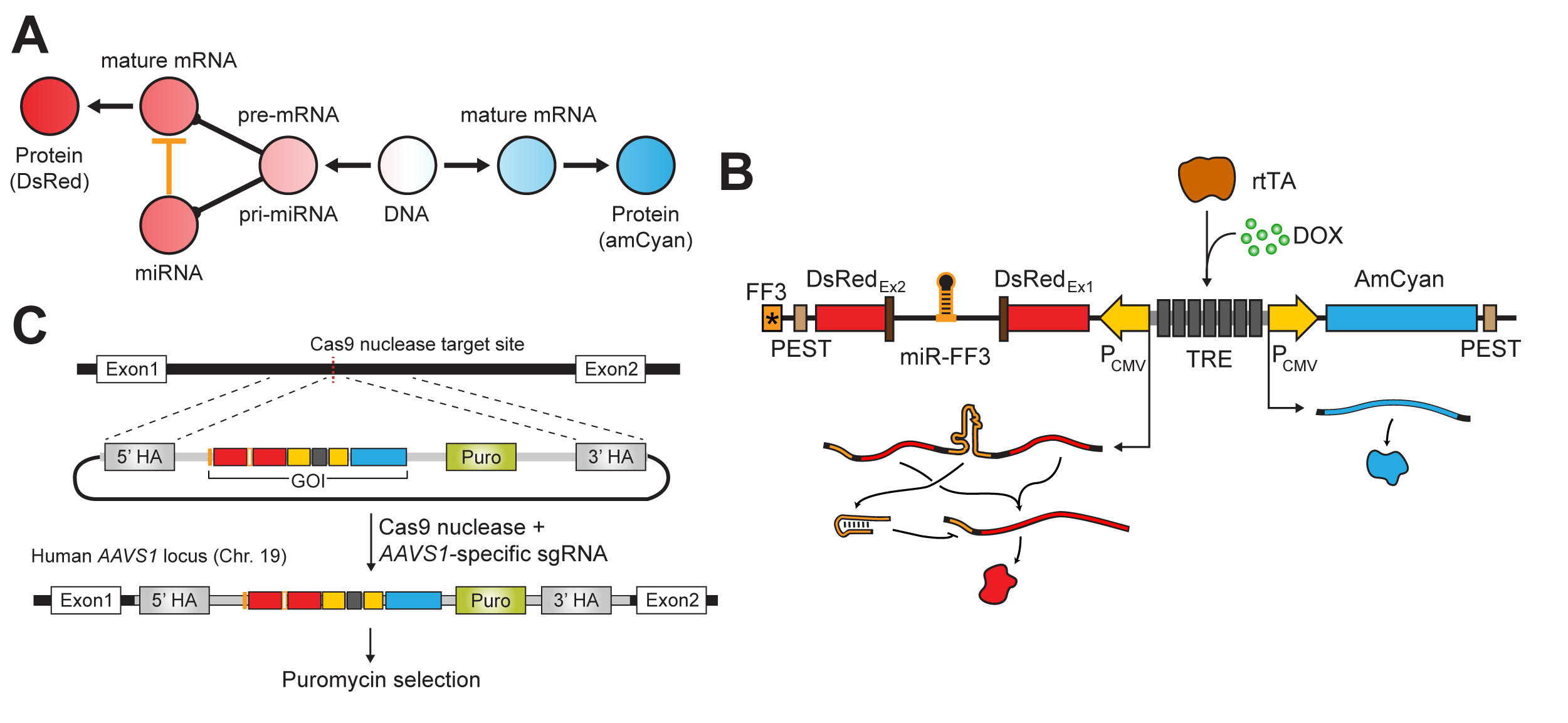 MicroRNAs (miRNAs) are short non-coding RNA molecules that regulate gene expression post-transcriptionally by binding to target messenger RNAs (mRNAs). Many human miRNAs are intragenic, located within introns of protein-coding sequence (host). Intriguingly, a percentage of intragenic miRNAs downregulate the host transcript forming an incoherent feedforward motif topology. Here, we study intragenic miRNA-mediated host gene regulation using a synthetic gene circuit stably integrated within a safe harbor locus of human cells. When the intragenic miRNA is directed to inhibit the host transcript, we observe a reduction in reporter expression accompanied by output filtering and noise reduction. Specifically, the system operates as a filter with respect to promoter strength, with the threshold being robust to promoter strength and measurement time. Additionally, the intragenic miRNA regulation reduces expression noise compared to splicing-alone architecture. Our results provide a new insight to miRNA-mediated gene expression, with direct implications to gene therapy and synthetic biology applications.   download