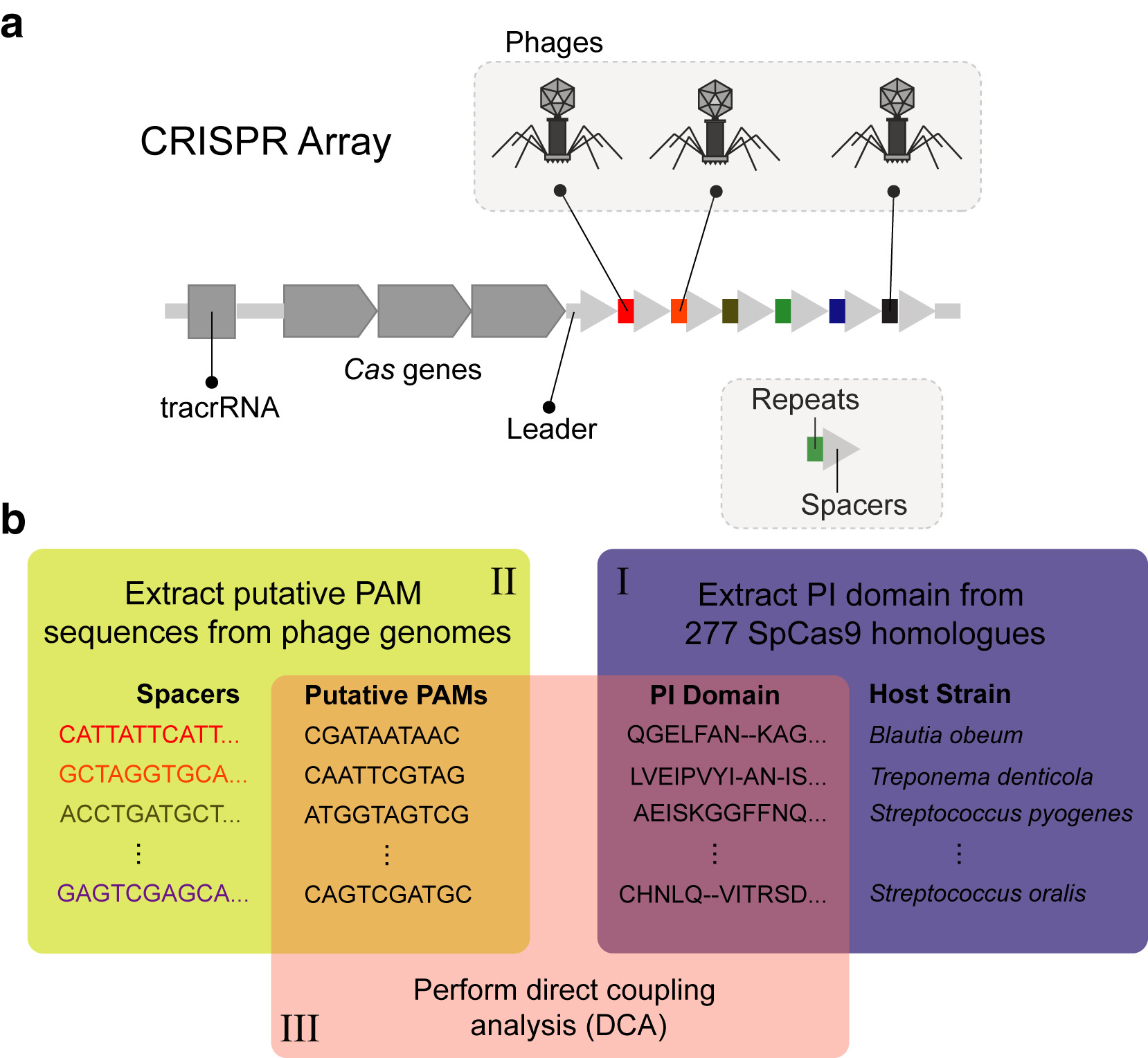 The clustered regularly interspaced short palindromic repeats (CRISPR) system, an immune system analog found in prokaryotes, allows a single-guide RNA to direct a CRISPR-associated protein (Cas) with combined helicase and nuclease activity to DNA. The presence of a specific protospacer adjacent motif (PAM) next to the DNA target site plays a crucial role in determining both efficacy and specificity of gene editing. Herein, we introduce a coevolutionary framework to computationally unveil nonobvious molecular interactions in CRISPR systems and experimentally probe their functional role. Specifically, we use direct coupling analysis, a statistical inference framework used to infer direct coevolutionary couplings, in the context of protein/nucleic acid interactions. Applied to Streptococcus pyogenes Cas9, a Hamiltonian metric obtained from coevolutionary relationships reveals, to our knowledge, novel PAM-proximal nucleotide preferences at the seventh position of S. pyogenes Cas9 PAM (5'-NGRNNNT-3'), which was experimentally confirmed by in vitro and functional assays in human cells. We show that coevolved and conserved interactions point to specific clues toward rationally engineering new generations of Cas9 systems and may eventually help decipher the diversity of this family of proteins.   download