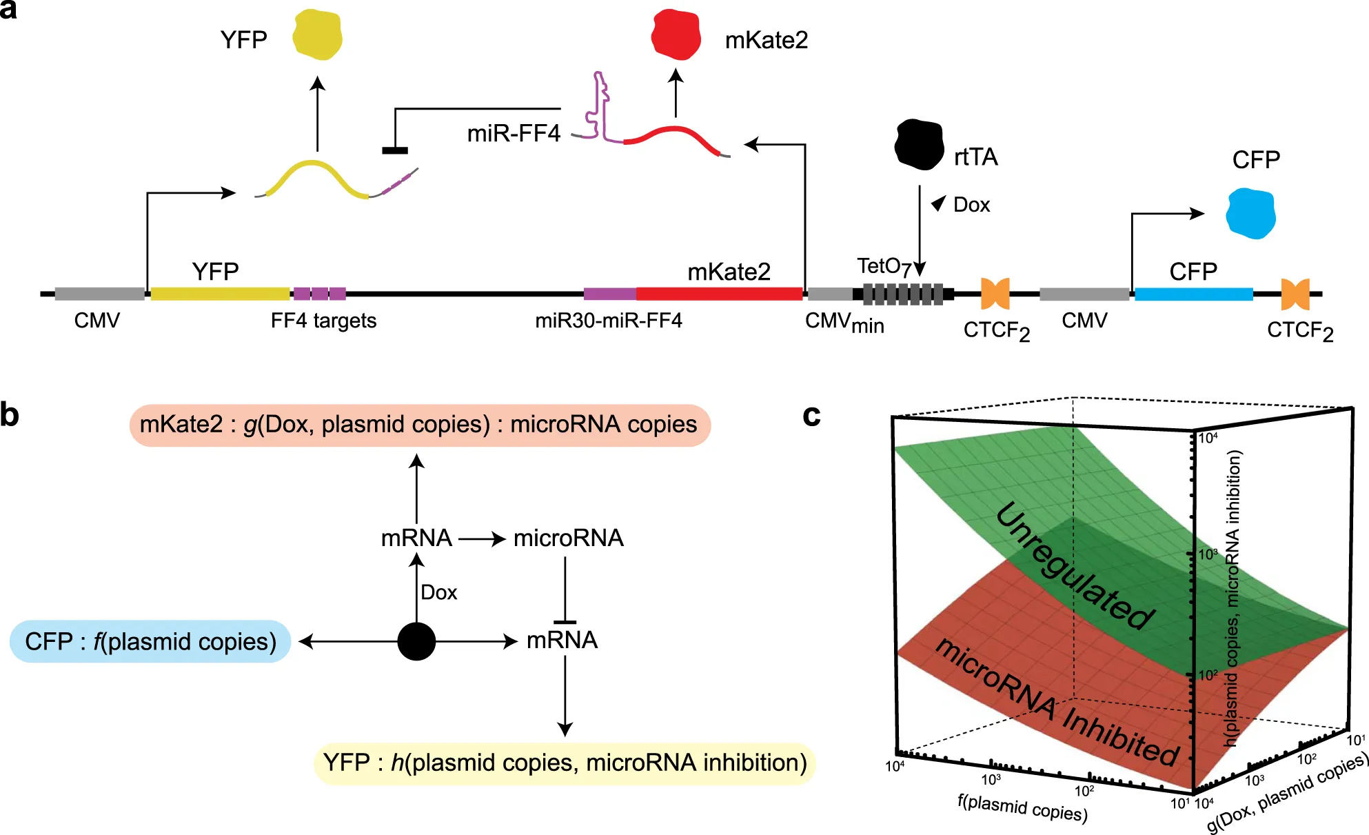 MicroRNAs are a class of short, noncoding RNAs that are ubiquitous modulators of gene expression, with roles in development, homeostasis, and disease. Engineered microRNAs are now frequently used as regulatory modules in synthetic biology. Moreover, synthetic gene circuits equipped with engineered microRNA targets with perfect complementarity to endogenous microRNAs establish an interface with the endogenous milieu at the single-cell level. The function of engineered microRNAs and sensor systems is typically optimized through extensive trial-and-error. Here, using a combination of synthetic biology experimentation in human embryonic kidney cells and quantitative analysis, we investigate the relationship between input genetic template abundance, microRNA concentration, and output under microRNA control. We provide a framework that employs the complete operational landscape of a synthetic gene circuit and enables the stepwise development of mathematical models. We derive a phenomenological model that recapitulates experimentally observed nonlinearities and contains features that provide insight into the microRNA function at various abundances. Our work facilitates the characterization and engineering of multi-component genetic circuits and specifically points to new insights on the operation of microRNAs as mediators of endogenous information and regulators of gene expression in synthetic biology.   download