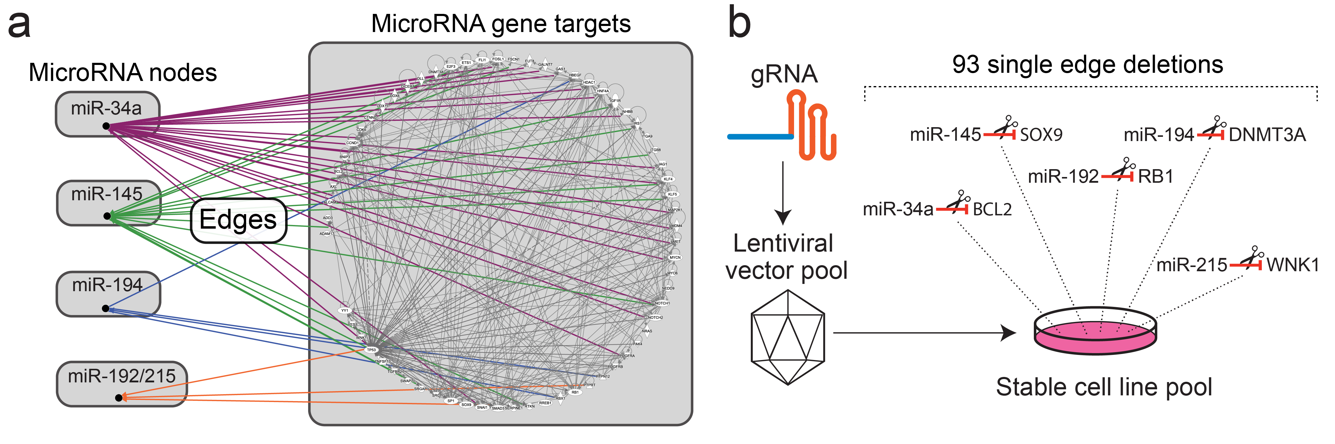 Unraveling the properties of biological networks is central to understanding both normal and disease cellular phenotypes. Networks consist of functional elements (nodes) that form a variety of diverse connections (edges), with each node being a hub for multiple edges. Herein, in contrast to node-centric network perturbation and analysis approaches, we present a high-throughput CRISPR-based methodology for delineating the role of network edges. Ablation of network edges using a library targeting 93 miRNA target sites in 71 genes reveals numerous edges that control, with variable importance, cellular growth and survival under stress. To compare the impact of removing nodes versus edges in a biological network, we dissect a specific p53-microRNA pathway. We show that removal of the miR-34a target site from the anti-apoptotic gene BCL2 desensitizes the cell to ectopic delivery of miR-34a in a p53-dependent manner. In summary, we demonstrate that network edges are critical to the function and stability of biological networks. Our results introduce a novel genetic screening opportunity via edge ablation and highlight a new dimension in biological network analysis.   download