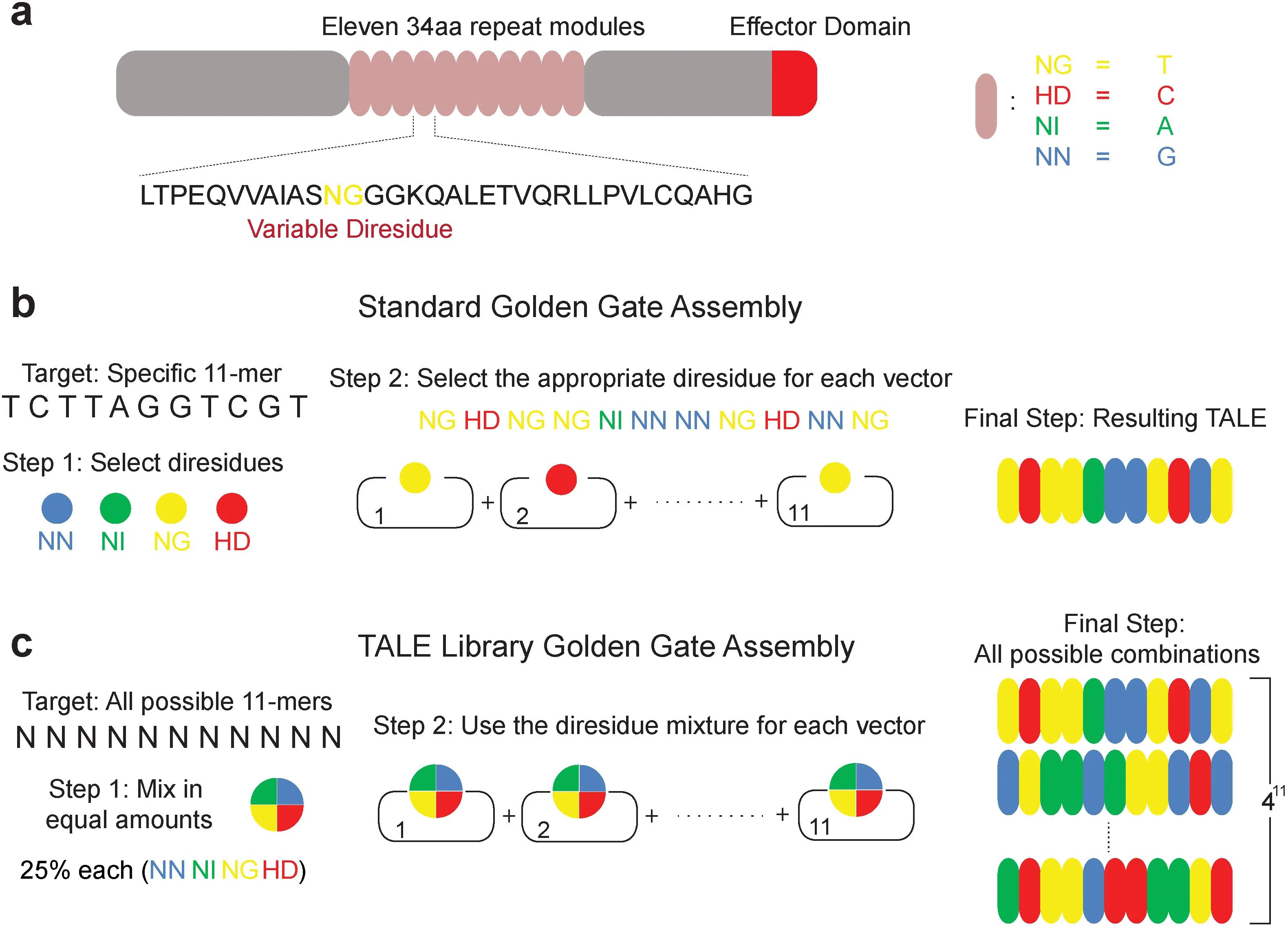 The ability to perturb individual genes in genome-wide experiments has been instrumental in unraveling cellular and disease properties. Here we introduce, describe the assembly, and demonstrate the use of comprehensive and versatile transcription activator-like effector (TALE) libraries. As a proof of principle, we built an 11-mer library that covers all possible combinations of the nucleotides that determine the TALE-DNA binding specificity. We demonstrate the versatility of the methodology by constructing a constraint library, customized to bind to a known p53 motif. To verify the functionality in assays, we applied the 11-mer library in yeast-one-hybrid screens to discover TALEs that activate human SCN9A and miR-34b respectively. Additionally, we performed a genome-wide screen using the complete 11-mer library to confirm known genes that confer cycloheximide resistance in yeast. Considering the highly modular nature of TALEs and the versatility and ease of constructing these libraries we envision broad implications for high-throughput genomic assays.   download