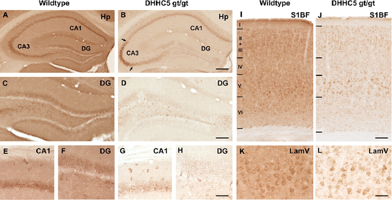 A family of integral membrane proteins containing a signature DHHC motif has been shown to display protein S-acyltransferase activity, modifying cysteine residues in proteins with fatty acids. The physiological roles of these proteins have largely been unexplored. Here we report that mice homozygous for a hypomorphic allele of a previously uncharacterized member, DHHC5, are born at half the expected rate, and survivors show a marked deficit in contextual fear conditioning, an indicator of defective hippocampal-dependent learning. DHHC5 is highly enriched in a post-synaptic density preparation and co-immunoprecipitates with post-synaptic density protein-95 (PSD-95), an interaction that is mediated through binding of the carboxyl terminus of DHHC5 and the PDZ3 domain of PSD-95. Immunohistochemistry demonstrated that DHHC5 is expressed in the CA3 and dentate gyrus in the hippocampus. These findings point to a previously unsuspected role for DHHC5 in post-synaptic function affecting learning and memory.   download