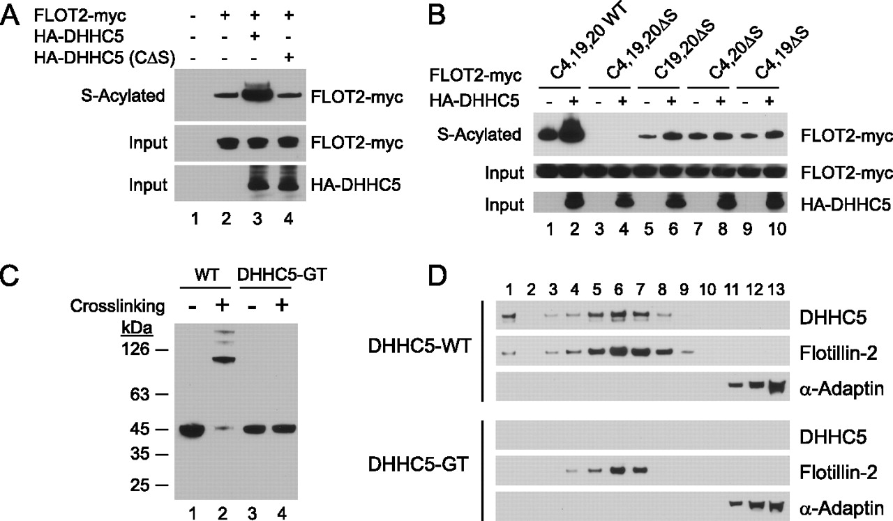 Post-translational palmitoylation of intracellular proteins is mediated by protein palmitoyltransferases belonging to the DHHC family, which share a common catalytic Asp-His-His-Cys (DHHC) motif. Several members have been implicated in neuronal development, neurotransmission, and synaptic plasticity. We previously observed that mice homozygous for a hypomorphic allele of the ZDHHC5 gene are impaired in context- dependent learning and memory. To identify potentially relevant protein substrates of DHHC5, we performed a quantitative proteomic analysis of stable isotope-labeled neuronal stem cell cultures from forebrains of normal and DHHC5-GT (gene-trapped) mice using the bioorthogonal palmitate analog 17-octadecynoic acid. We identified ~300 17-octadecynoic acid-modified and hydroxylamine-sensitive proteins, of which a subset was decreased in abundance in DHHC5-GT cells. Palmitoylation and oligomerization of one of these proteins (flotillin-2) was abolished in DHHC5-GT neuronal stem cells. In COS-1 cells, overexpression of DHHC5 markedly stimulated the palmitoylation of flotillin-2, strongly suggesting a direct enzyme-substrate relationship. Serendipitously, we found that down-regulation of DHHC5 was triggered within minutes following growth factor withdrawal from normal neural stem cells, a maneuver that is used to induce neural differentiation in culture. The effect was reversible for up to 4 h, and degradation was partially prevented by inhibitors of ubiquitin-mediated proteolysis. These findings suggest that protein palmitoylation can be regulated through changes in DHHC PAT levels in response to differentiation signals.  download