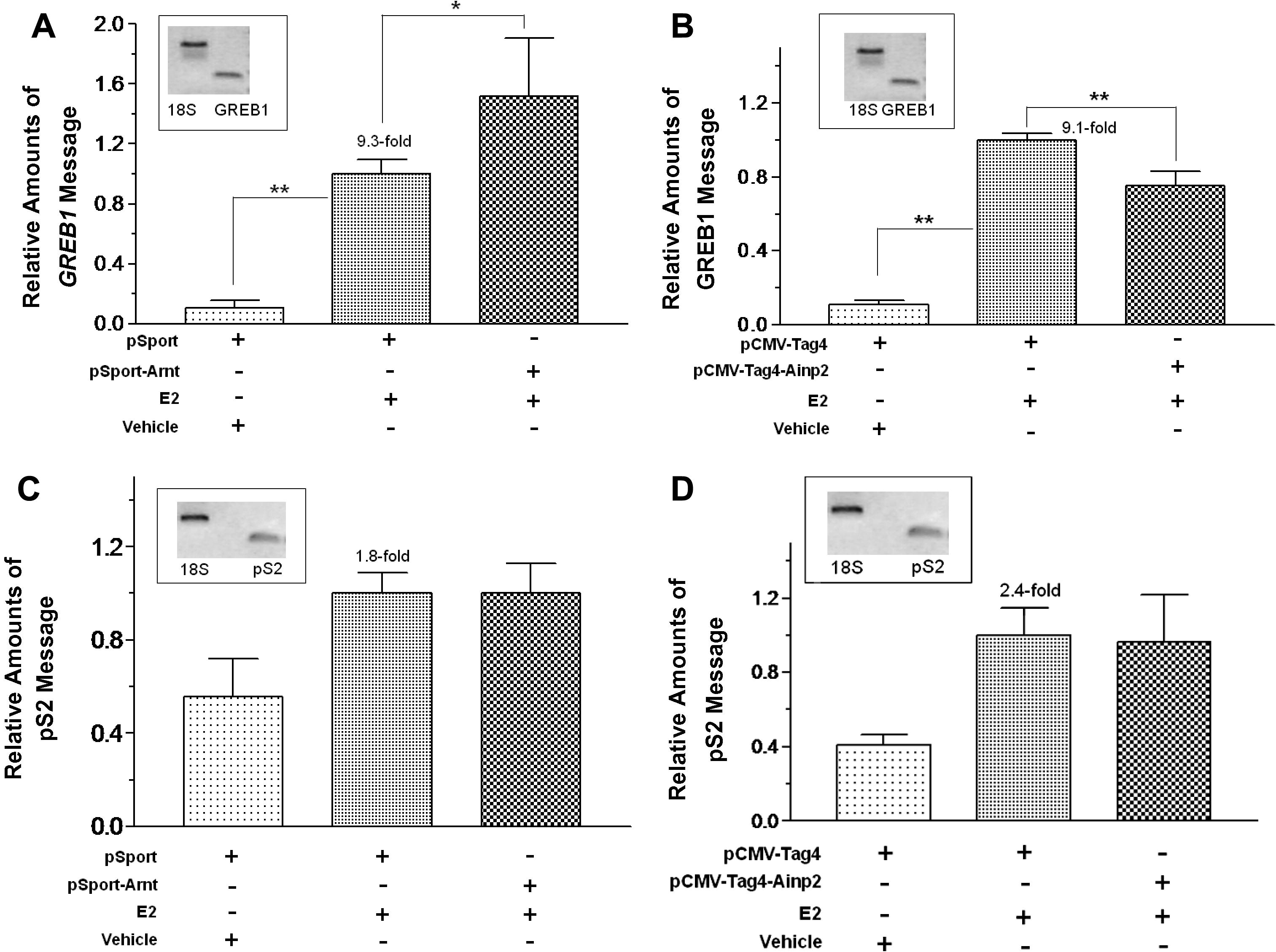 We explored whether modulation of the estrogen receptor (ER) signaling is possible through an aryl hydrocarbon receptor nuclear translocator (Arnt)-dependent mechanism. We utilized the Arnt-interacting protein 2 (Ainp2) to examine whether the presence of Ainp2 in MCF-7 cells would interfere with the Arnt-mediated ER signaling. We found that Arnt increased the 17 beta-estradiol (E2)-dependent luciferase activity and Ainp2 significantly suppressed this Arnt-mediated luciferase activity. Ainp2 significantly suppressed 25% of the E2- and Arnt-dependent upregulation of the GREB1 message. No suppression of the ER target gene expression by Ainp2 was detected in Arnt-knockdown MCF-7 cells and in Arnt-independent ER signaling. Although Ainp2 did not interact with ER alpha and ER beta, it suppressed the ER alpha::Arnt interaction and reduced the E2- driven recruitment of Arnt to the GREB1 promoter. We concluded that Ainp2 suppresses the ER signaling by not allowing Arnt to participate in the ER-dependent, Arnt-mediated activation of gene transcription.  download